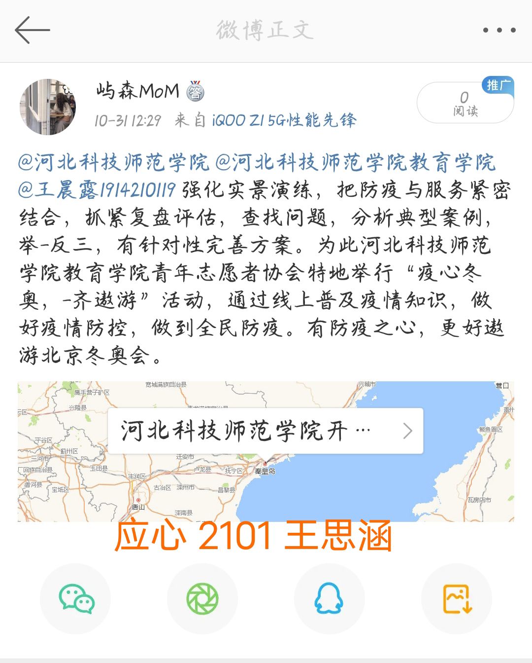 考虑到疫情的形势变化和冬奥的临近,为做好疫情防护工作,提高师生防疫知识与意识,更好地为迎接2022年北京冬奥会做准备,2021年10月31日,雷竞技RAYBET开展了微博打卡志愿者活动。