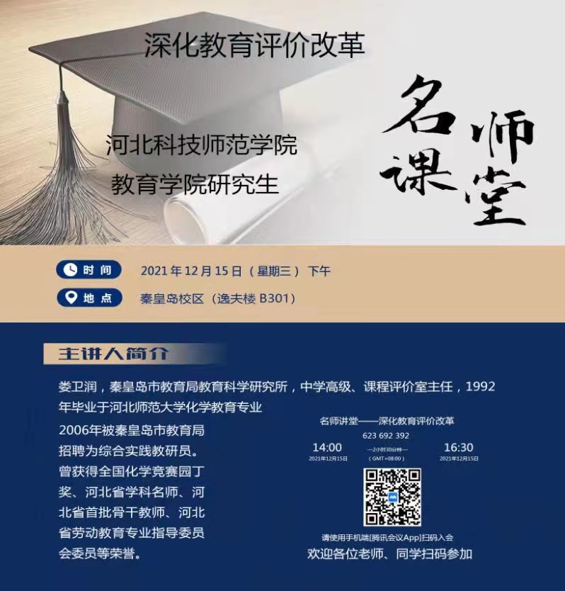 学术讲座预告:12月15日14:00,娄卫润主任;深化教育评价改革