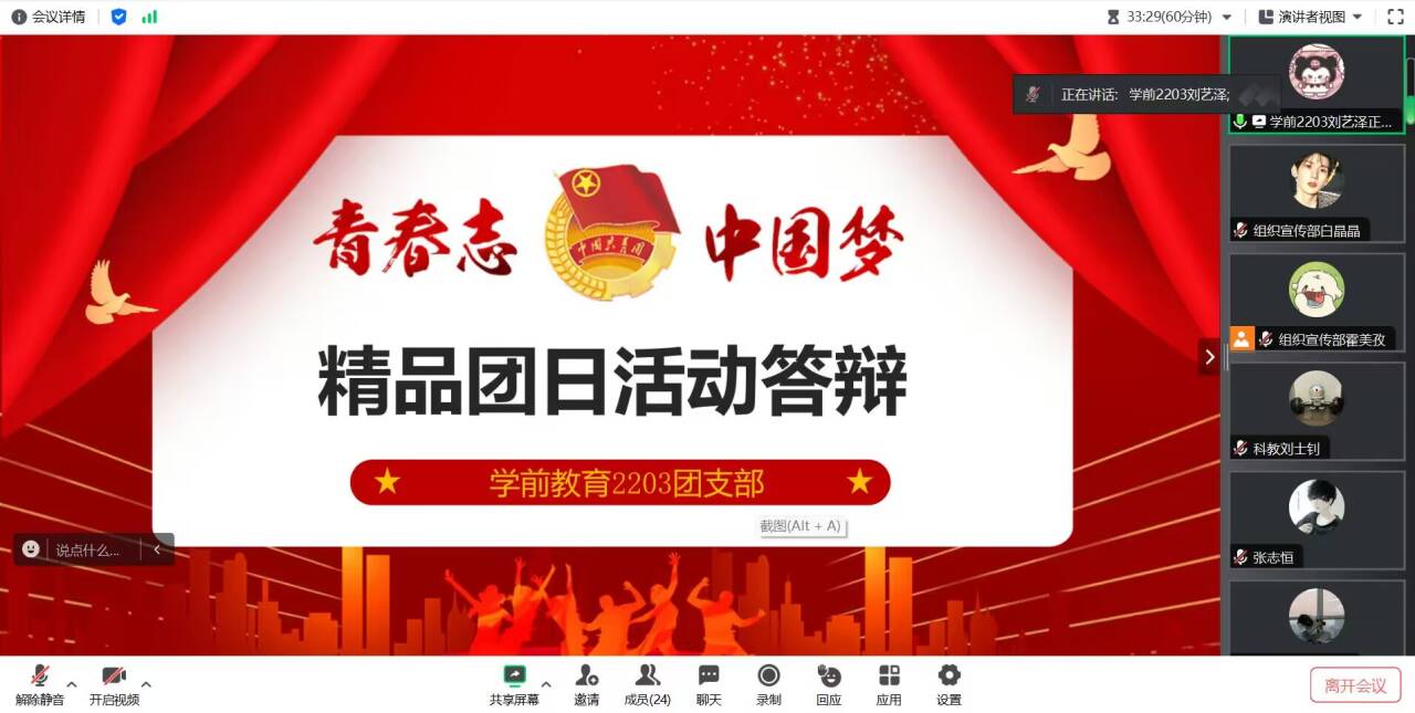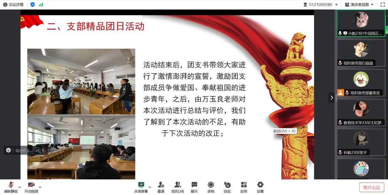 会议上,各团支书按照年级及专业顺序依次进行答辩。每位团支书答辩时间控制在三分钟以内,答辩内容包括对各自团支部情况介绍和2023年举办精品团日活动汇总、活动记录及活动展示。其中,各团支书主要介绍、展示了精品团日活动的活动内容及活动记录,并总结了活动过程中出现的问题与不足,助力提高今后精品团日活动的质量。团日活动团结支部成员,综合提升团支部成员各方面能力。