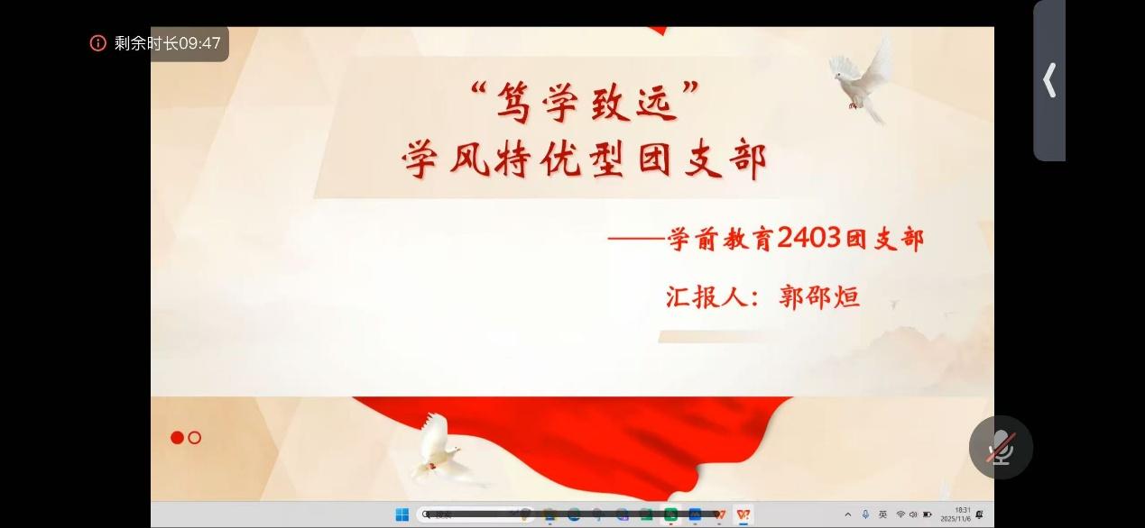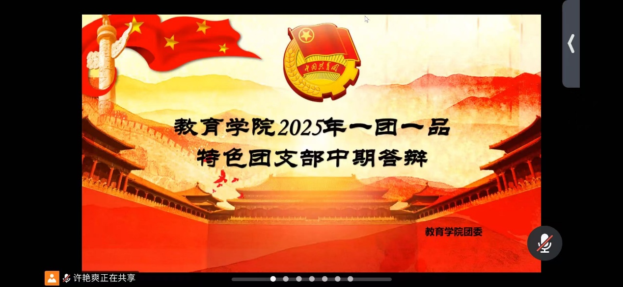 活动当天,工作人员线上确认人数,并宣布答辩活动正式开始,进行答辩的团支书围绕“规定动作”与“自选动作”结合PPT对支部创建进度、成果亮点、创新做法及各支部的创建完成情况等进行答辩,最后老师对会议内容进行了总结与点评,为以后团支书工作的展开提供了建议和指导。