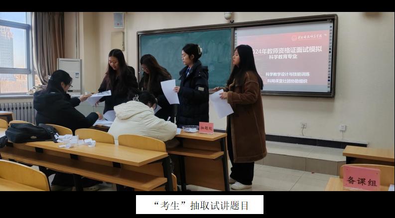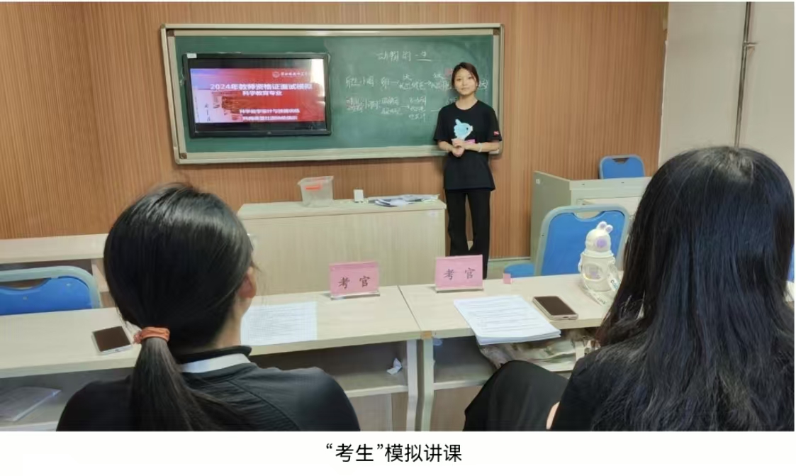 活动当天,在李建英、李春艳和周哲三位指导教师的精心准备和科网课堂社团成员的协助组织下,录播教室被布置成备课室,微格教室被布置成标准的面试考场,从核对信息、抽取题目到备课、试讲等全方位模拟了真实的面试环境。科学教育专业2022级员工按照模拟演练的对应批次时间进入考场进行试讲和答辩。指导教师们和科网课堂社团的成员们扮演“考官”,对每位“考生”进行提问,并进行点评和提出建议。