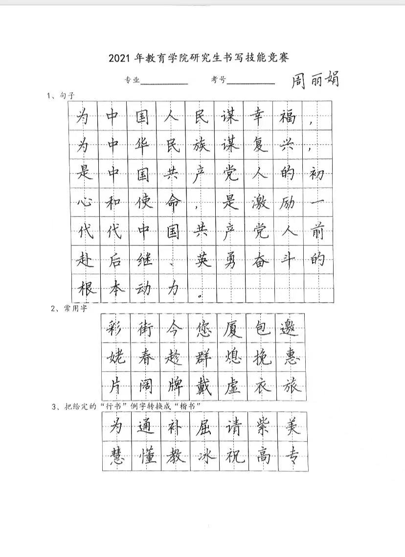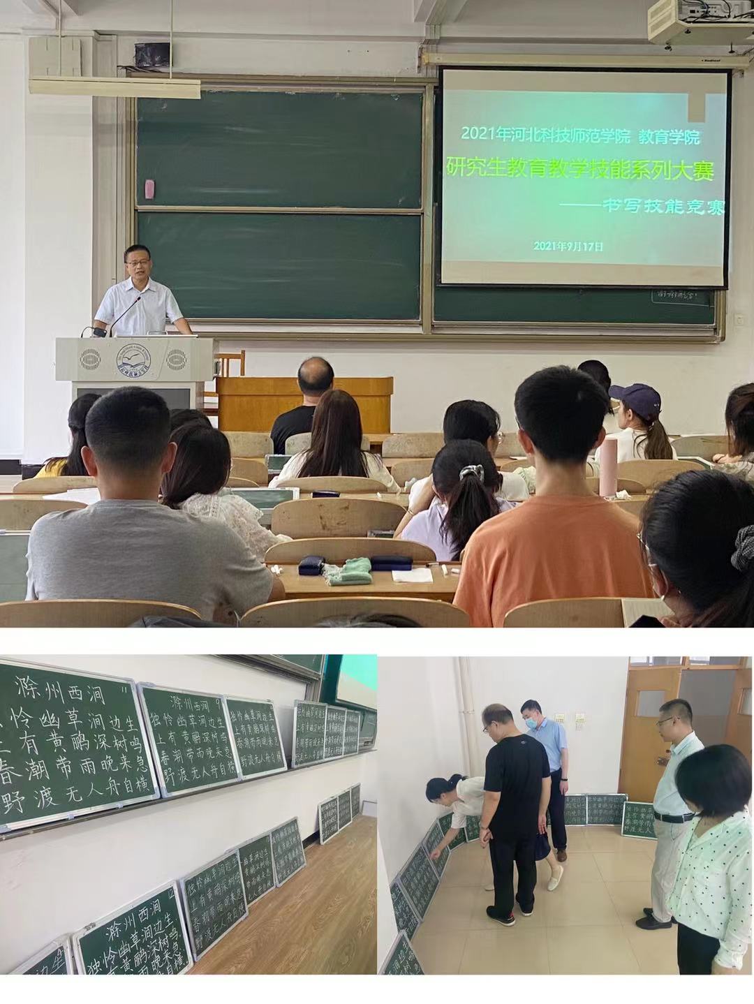 9月17日,2021年雷竞技RAYBET研究生公司产品系列大赛——书写技能竞赛在秦皇岛校区逸夫楼顺利举办。40余位2019级、2020级教育硕士、教育学研究生参加比赛,5位公司领导及教师担任评委。书写技能大赛的比赛项目分粉笔字和钢笔字部分,所有参赛选手同场竞技、现场书写进行比赛。参赛选手们认真专注地书写,以合理规范的板书设计呈现教学内容。每组选手书写完毕后,由评委点评并打分。