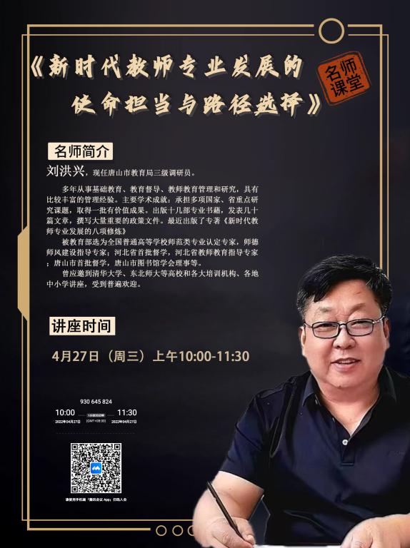 学术讲座预告:4月27日10:00,刘洪兴调研员:新时代教师专业发展的使命担当与路径选择